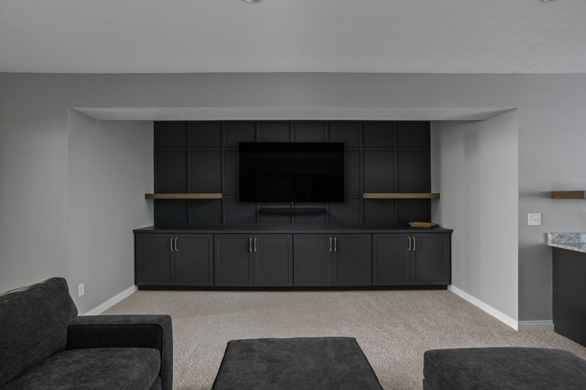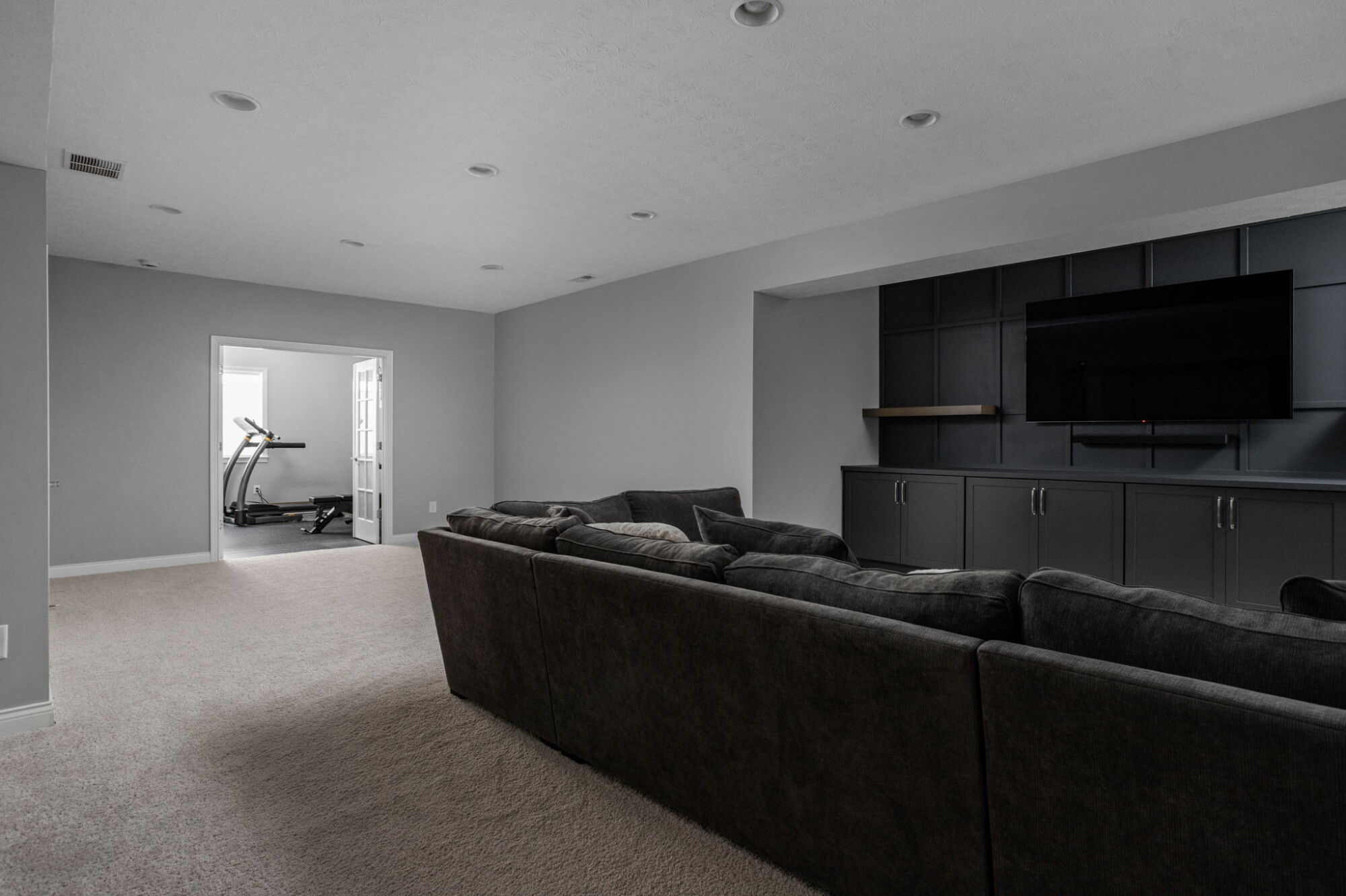 The basement remodel added more than extra square footage. It introduced purpose-built areas that support how a family lives now and how the home can adapt over time. The finished basement includes a bar area, TV area, bedroom, exercise room, and lower-level living space organized for everyday use. Custom millwork and storage were also thoughtfully integrated into the bar, TV wall, and mudroom cabinetry, helping each area feel purposeful and well resolved.
