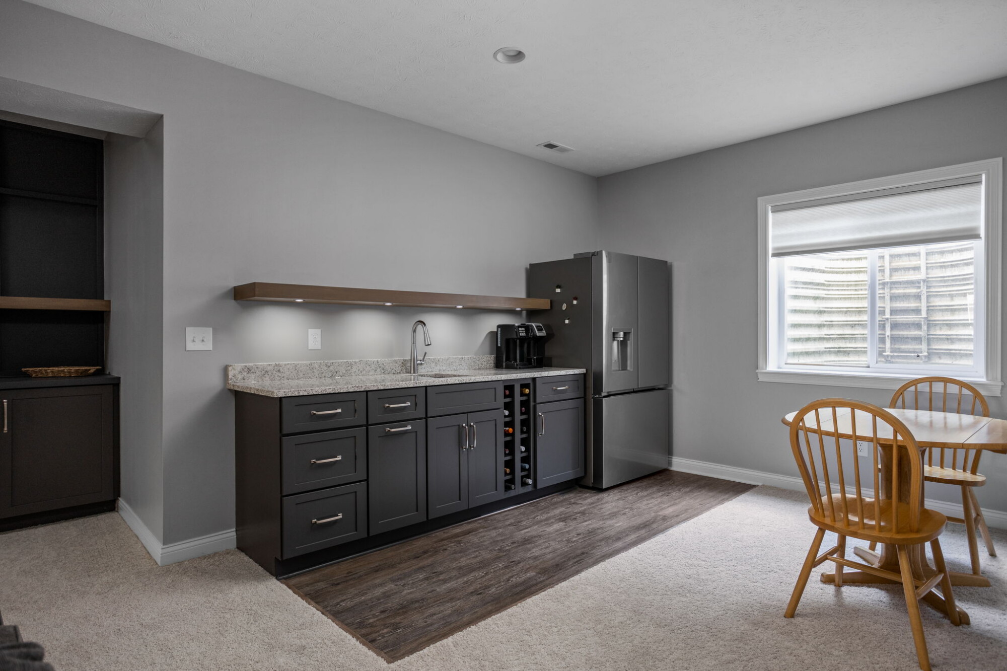 The bar area includes base cabinetry, a granite countertop with 4-inch backsplash, a stainless undermount bar sink, a bar sink faucet, and a site-built poplar floating shelf. The lower level also includes a dedicated exercise room with rubber flooring, while the bar area features LVP flooring. Together, those decisions give the basement a more complete role in daily life. This is not simply extra space. It is living space planned with intention.