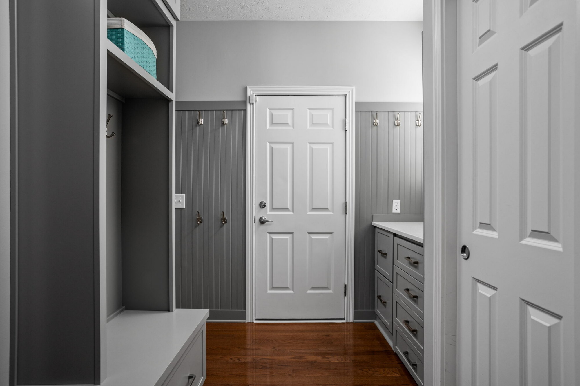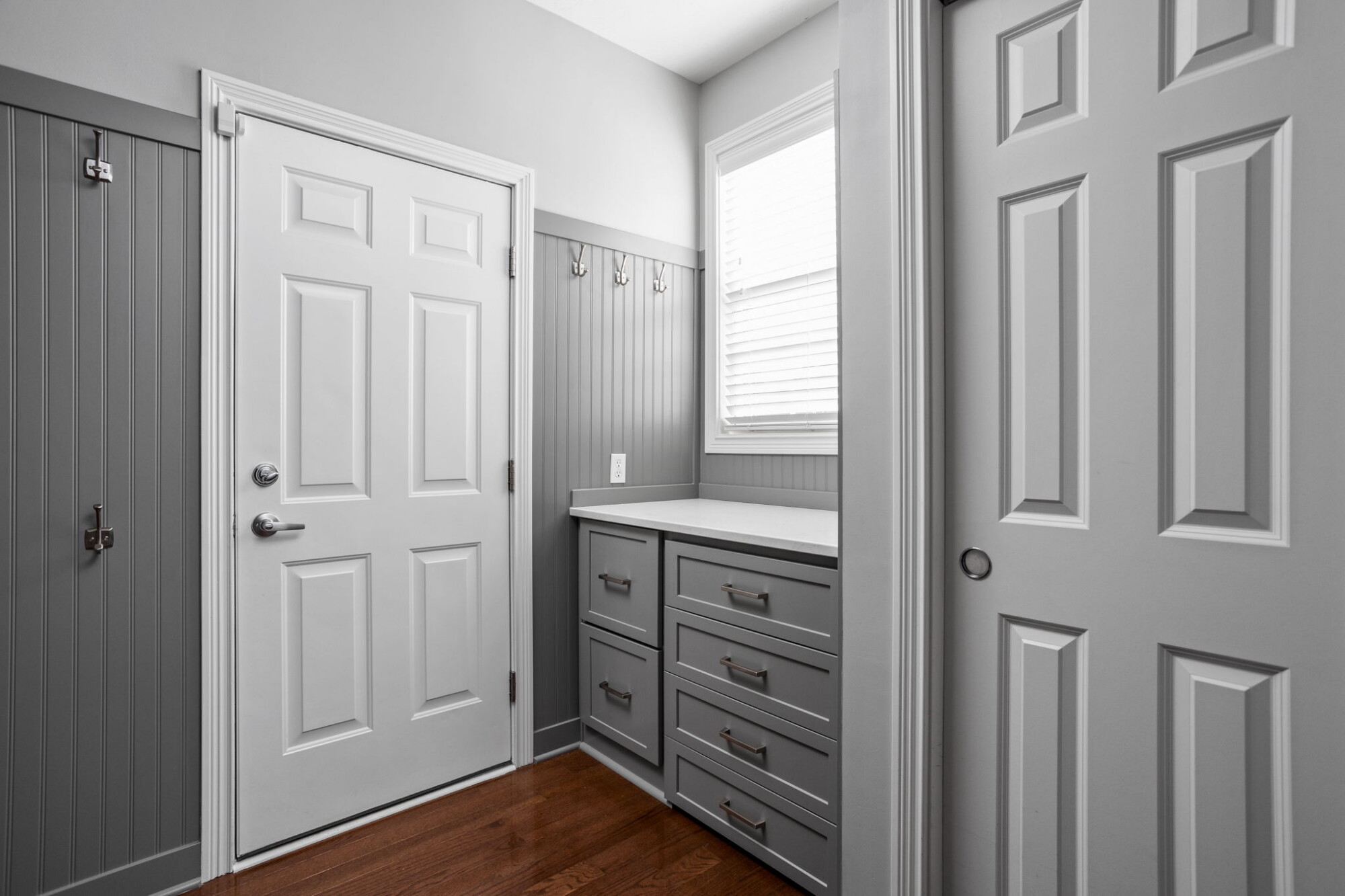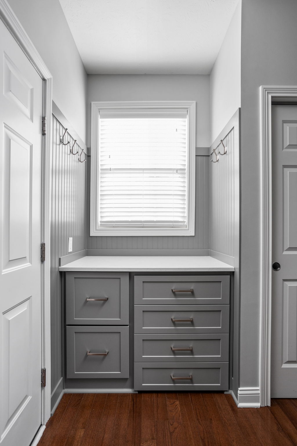 Mudrooms are often modest in size but significant in impact. In this Carmel remodel, the mudroom update added custom storage details that help the space work harder for the household. The mudroom features new cabinetry, a bench cabinet with a matching wood top, four roll-out shoe storage trays, a quartz countertop, beaded plywood with wood trim on three walls, and wall hooks.