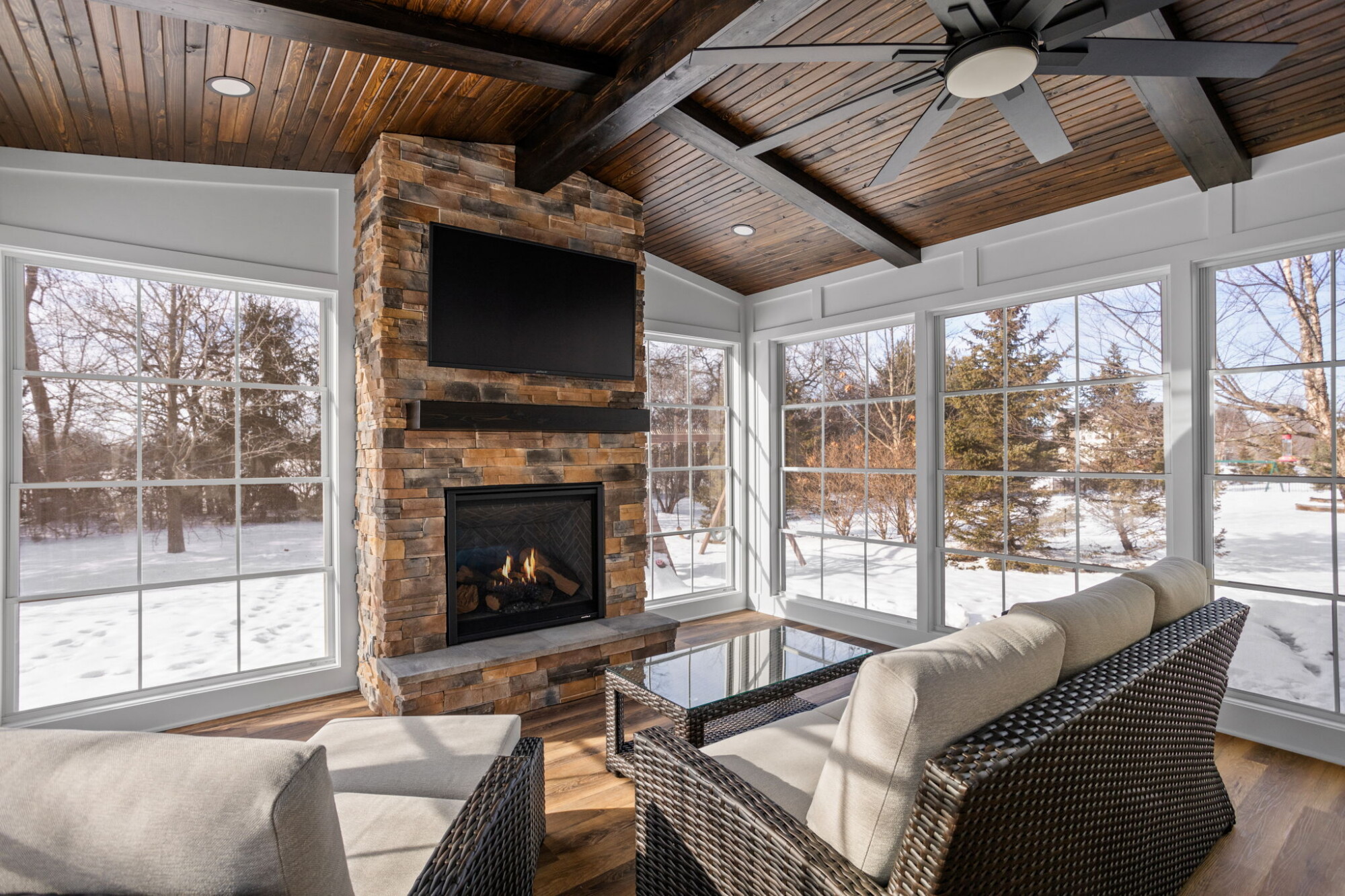 A 3-season sunroom addition is designed to extend the use of the home through much of the year while keeping a stronger connection to the outdoors. In this project, the sunroom includes Eze-Breeze windows and door, LVP flooring, a direct-vent gas fireplace, a pine tongue and groove ceiling, smooth cedar faux beams, cultured stone veneer, and a smooth cedar mantel. Those features create a comfortable, finished space while maintaining the character of a 3-season sunroom rather than a fully conditioned year-round addition tied into the home’s main HVAC system.