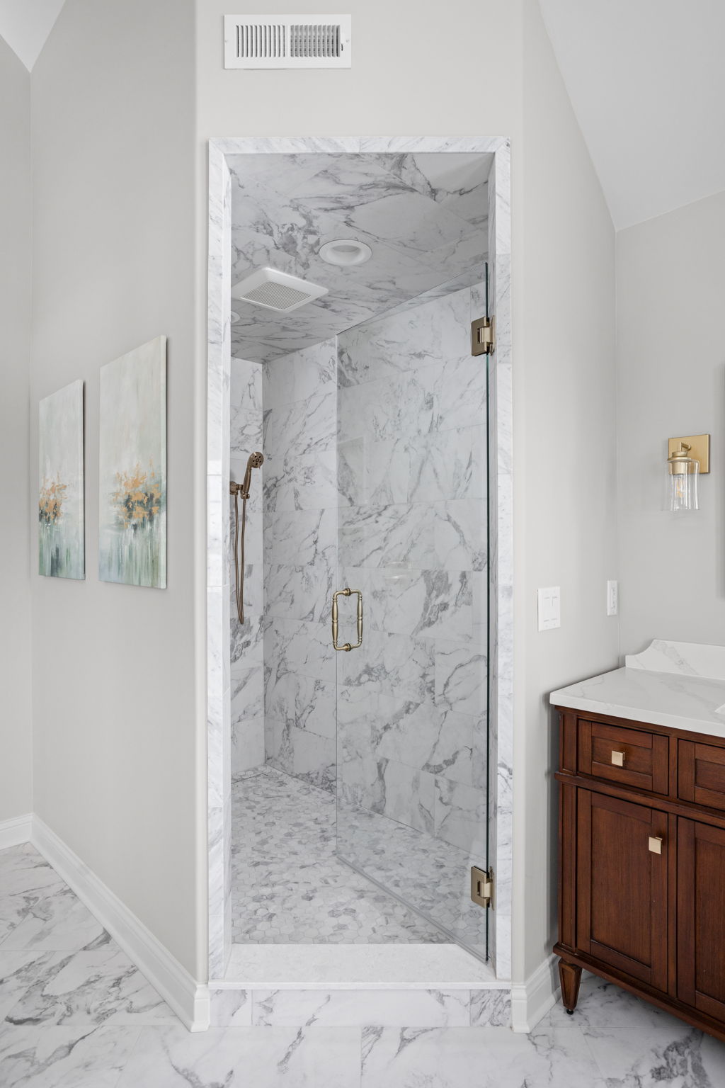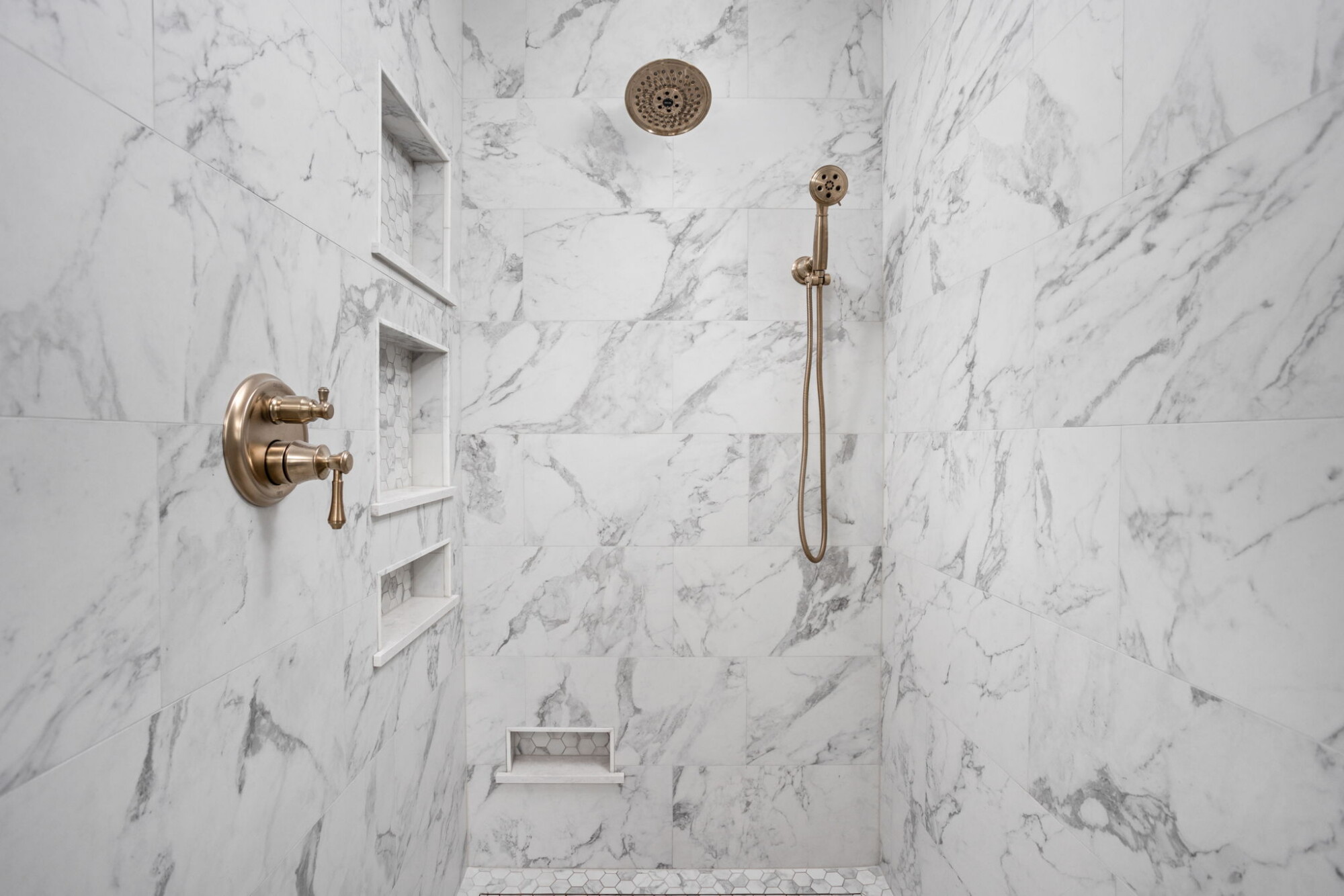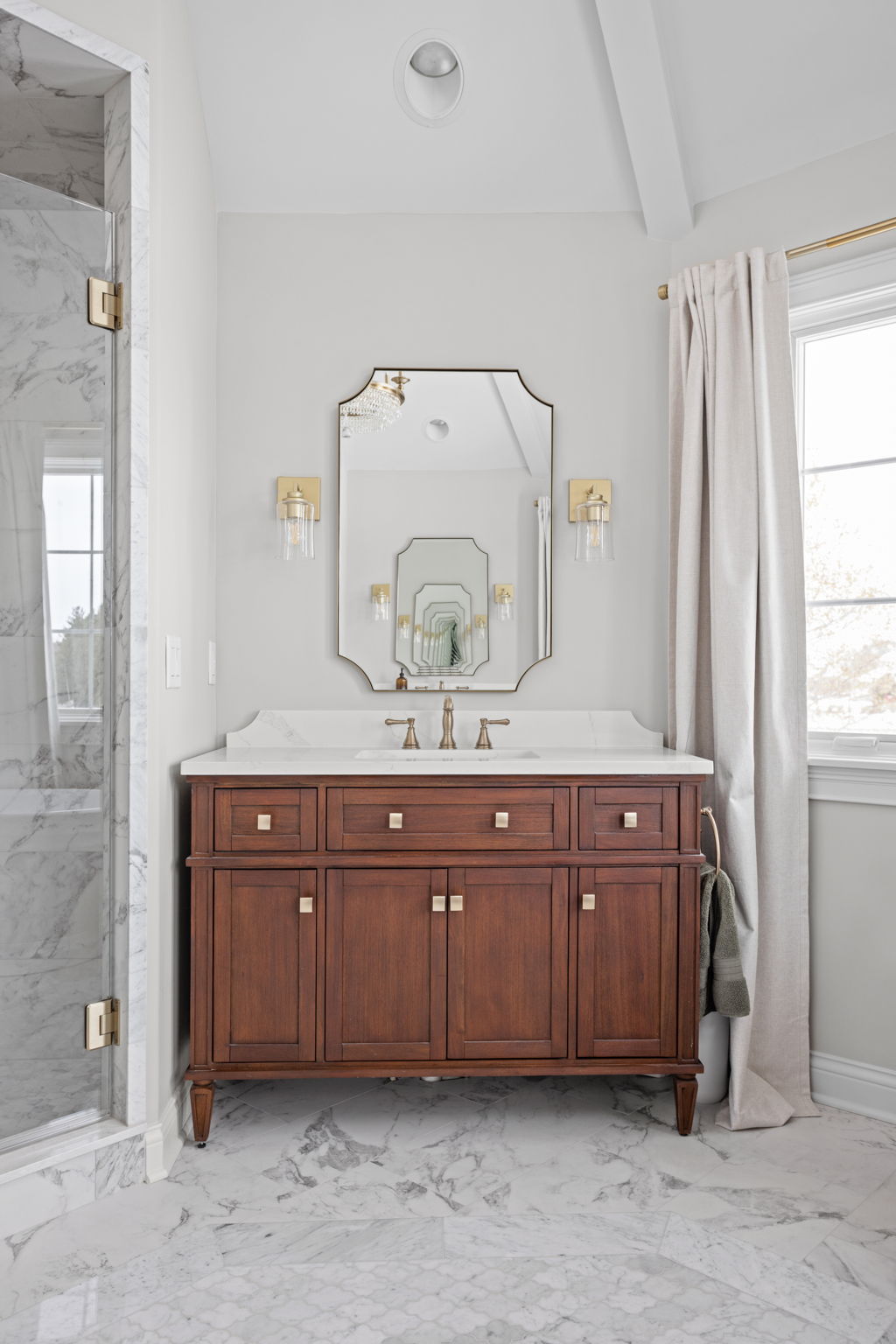 This project includes a heated floor system beneath the marble mosaic tile in the primary bath. That decision supports the broader intent of the remodel, which was to create a more refined and comfortable space rather than stopping at surface level upgrades. For many homeowners, heated flooring becomes one of the details they appreciate most after the remodel is complete.