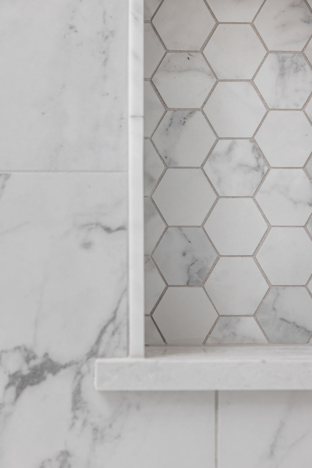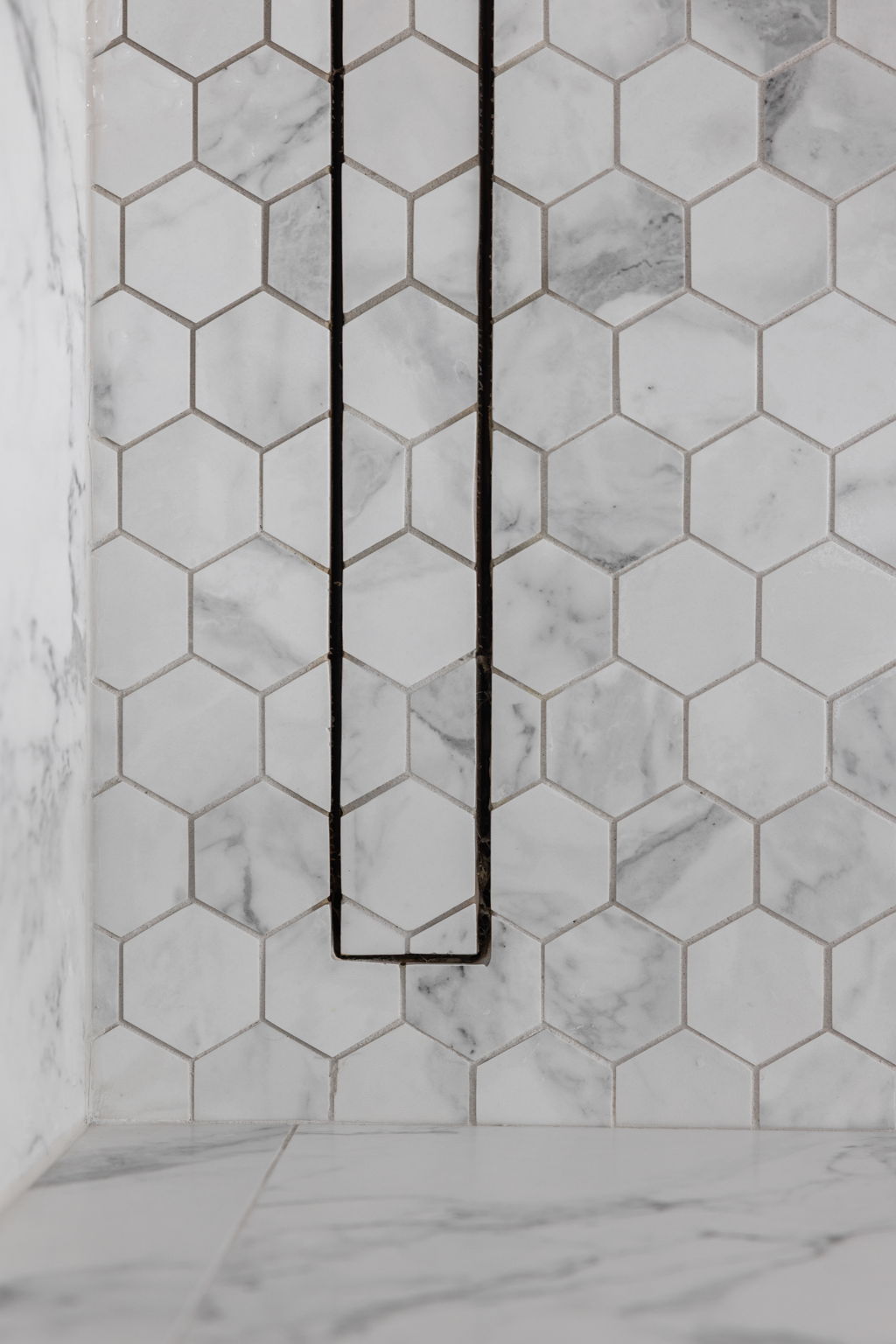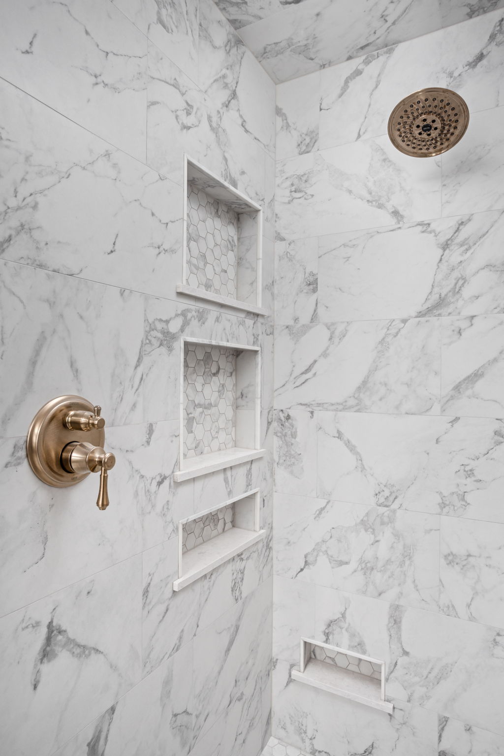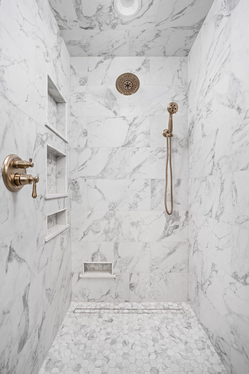 One of the defining changes in the bath is the revised shower area. The project scope called for widening the existing shower door opening by about six inches and matching the soffit height to the new configuration. New shower niches, a new linear drain, updated shower plumbing, glass enclosure work, and quartz trim details all contribute to a cleaner and more tailored result. The shower wall tile and mosaic floor selections help the space feel finished from every angle while also reinforcing the room’s custom character.