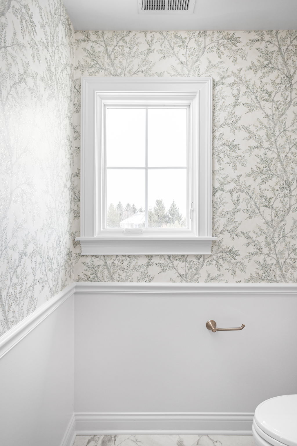 This project includes more than plumbing and tile changes. It also adds architectural detail that helps the bathroom feel more custom and more connected to the home. Decorative painted wood beams were added at the vaulted ceiling, drawing the eye upward and giving the room stronger visual structure. Wallpaper in the water closet and primary closet areas adds softness and continuity, helping these adjacent spaces feel coordinated with the bath rather than separate from it.