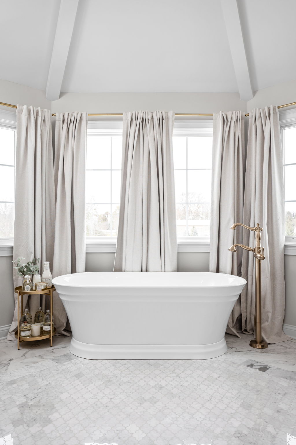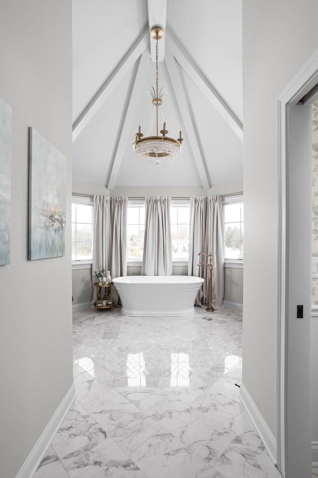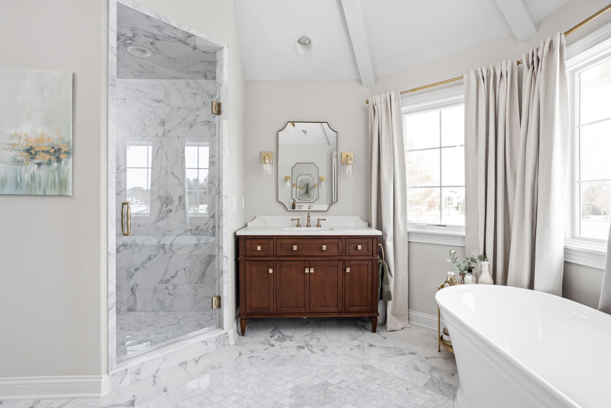This Carmel primary bath remodel includes a freestanding tub, dual vanities, a widened shower opening, a new linear shower drain, shower niches, glass enclosure work, heated marble mosaic floor tile, quartz trim details, updated lighting, new accessories, decorative painted ceiling beams, and wallpaper in adjoining water closet and closet areas.