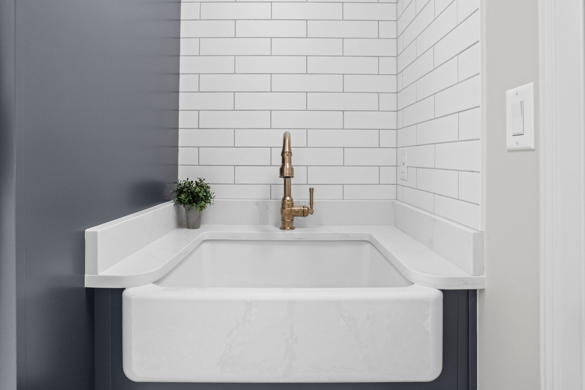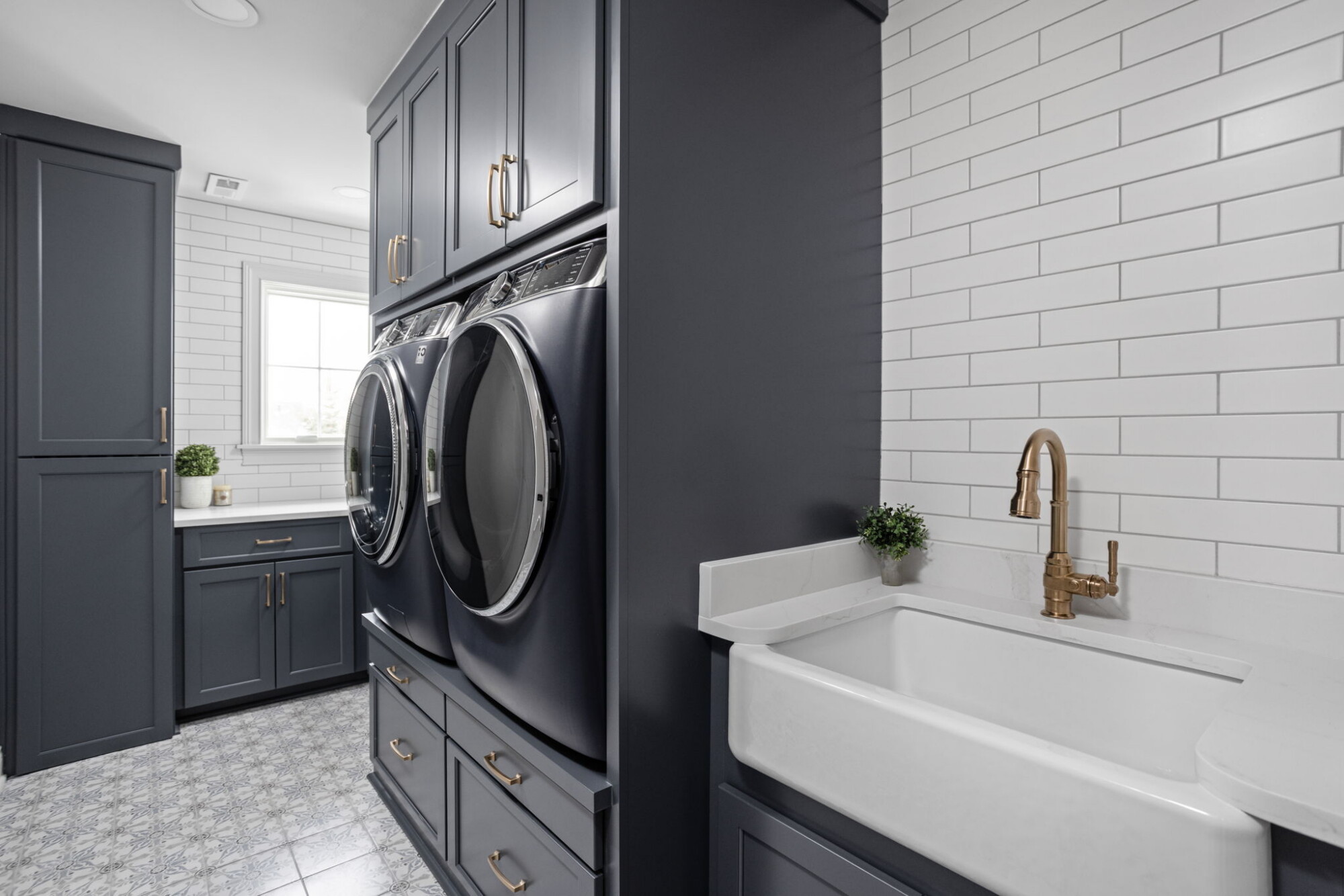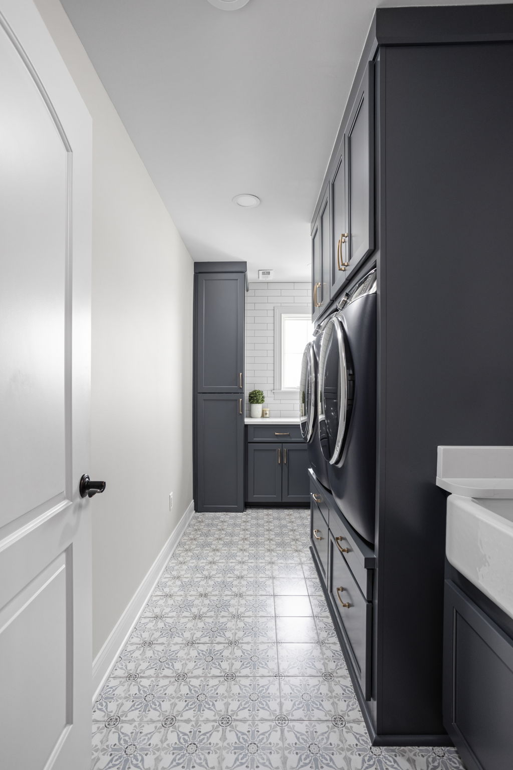 The laundry room renovation brings the same level of planning into a space that often gets overlooked. In this home, the laundry room was redesigned with custom cabinetry, new counters, a tile backsplash, a new apron front sink, updated paint, improved venting, and a more intentional built in arrangement around the washer and dryer. Rather than treating the laundry room as a purely utilitarian space, the remodel gives it the same sense of finish seen elsewhere in the home.