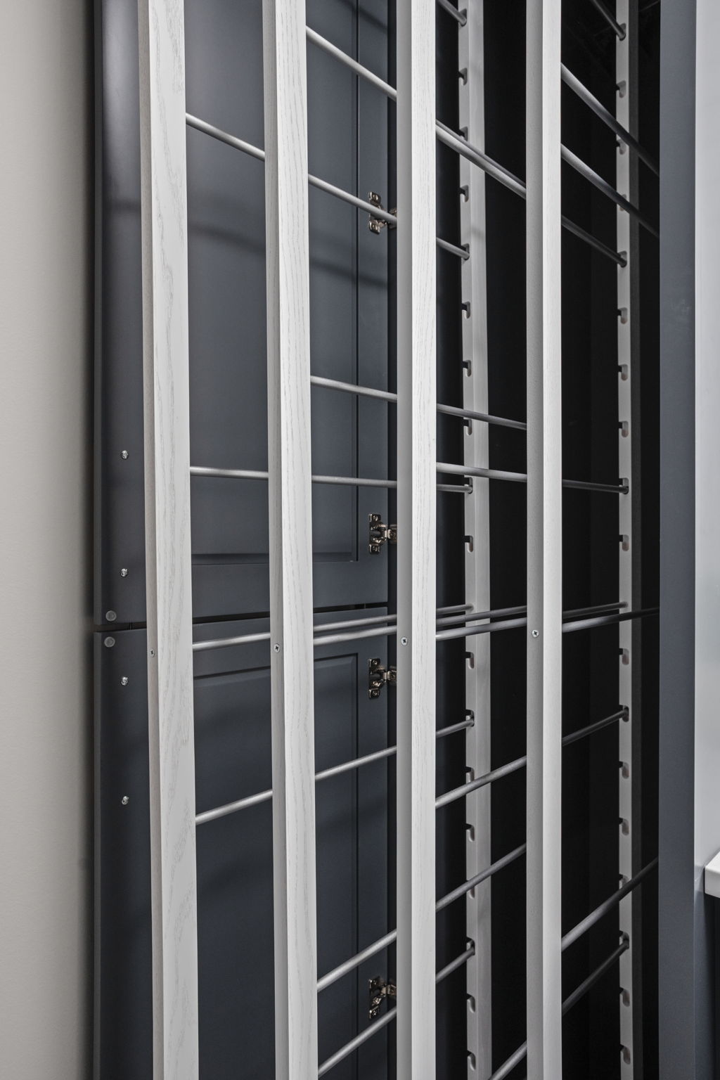 In this project, the custom laundry cabinetry creates a built in appearance around the washer and dryer and includes a pull out drying rack, sink base, upper storage, and surrounding millwork details. That tailored approach helps the room feel more intentional, keeps essentials organized, and gives the laundry room a finished look that matches the level of design seen in the primary bath.