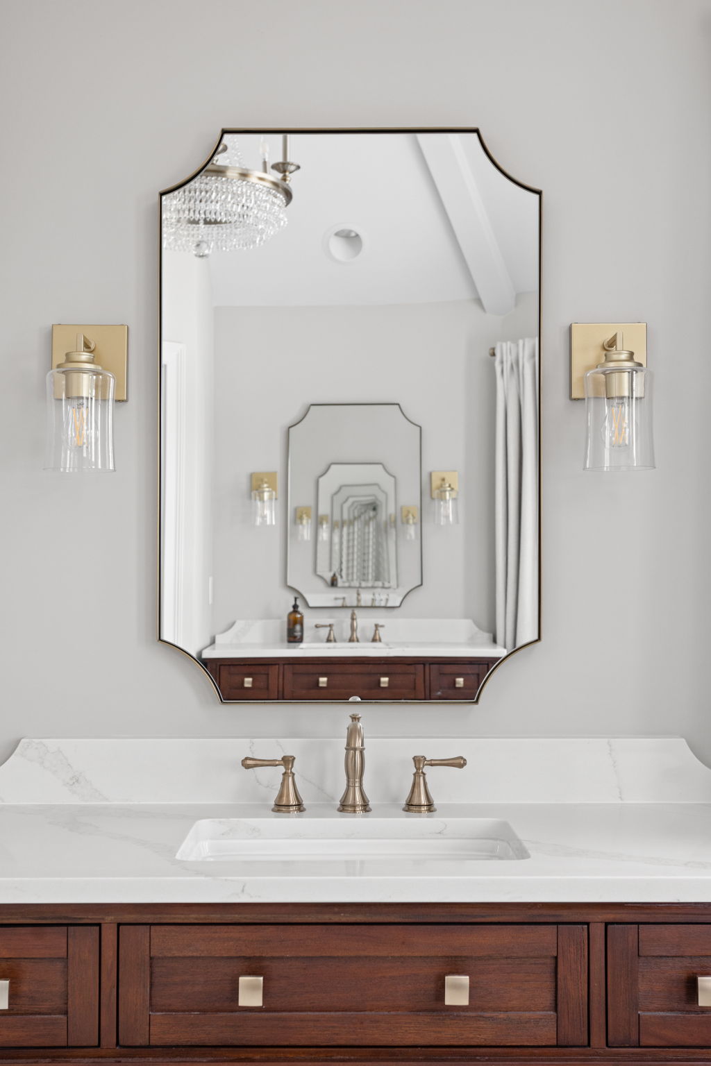 The vanities and decorative selections reinforce that sense of character. Dark wood vanity furniture, quartz backsplashes, updated sconces, and a statement chandelier bring warmth and refinement to the room. The result is a bathroom remodel that feels elevated without losing its everyday practicality.