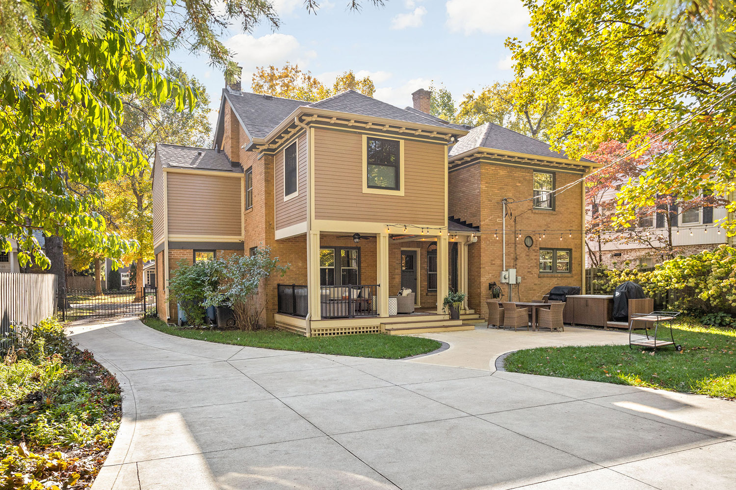 Wood wrapped posts, a warm wood ceiling, integrated lighting, and a ceiling fan create comfort during Indiana’s warmer months. This is not simply a slab extension. It is an intentional outdoor living area that supports dining, relaxing, and entertaining.