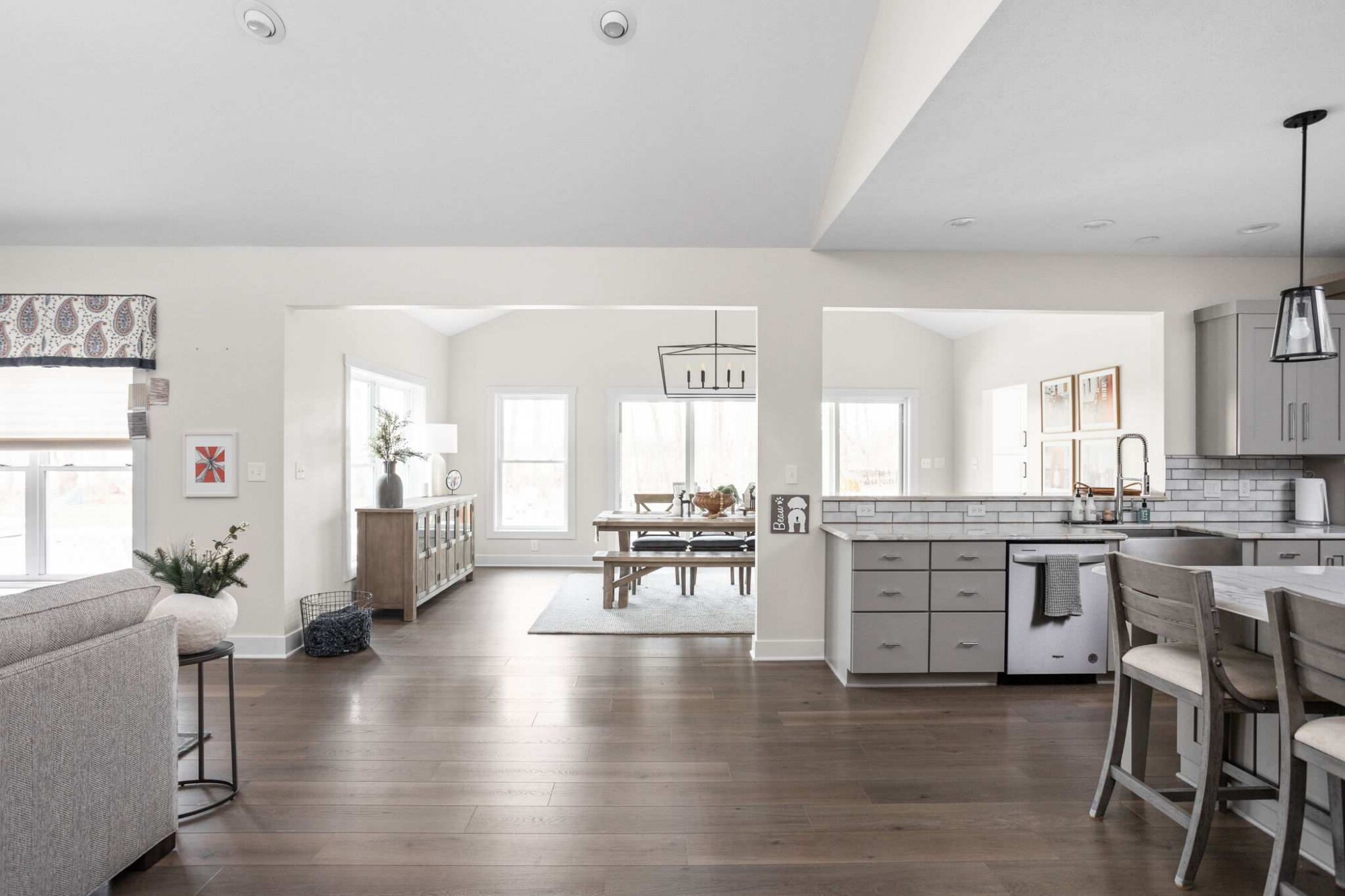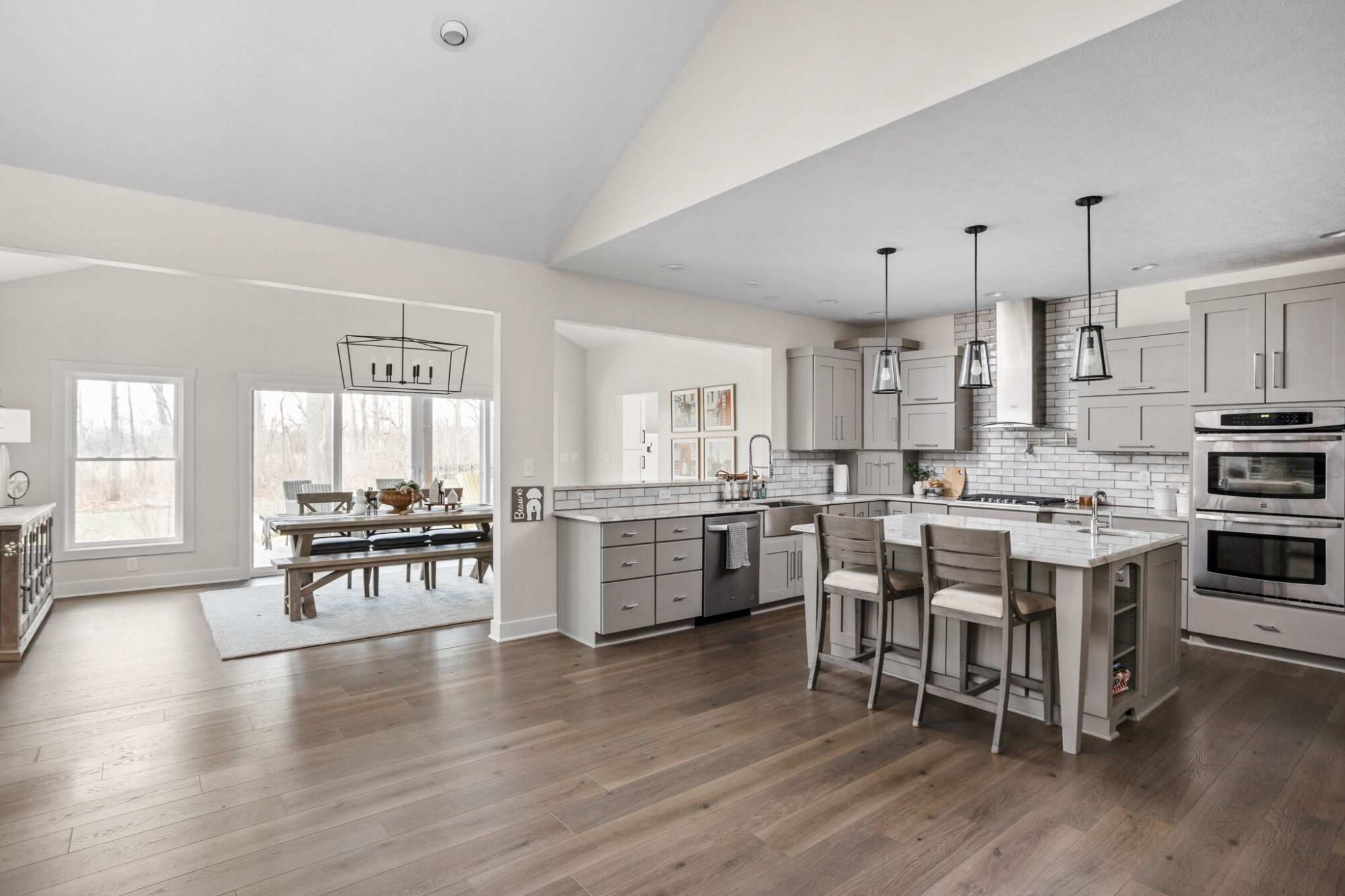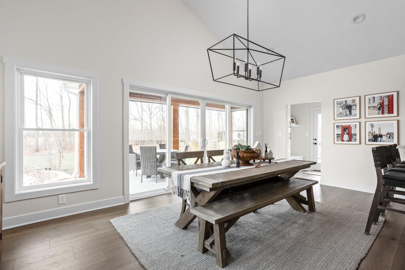 Large windows and a four-panel sliding door bring in natural light and views of the backyard and covered patio. The ceiling vault adds volume and architectural interest, creating a sense of openness while still maintaining visual connection to the adjacent kitchen and living areas. A structural beam defines the transition between spaces, allowing the rooms to feel connected yet distinct.