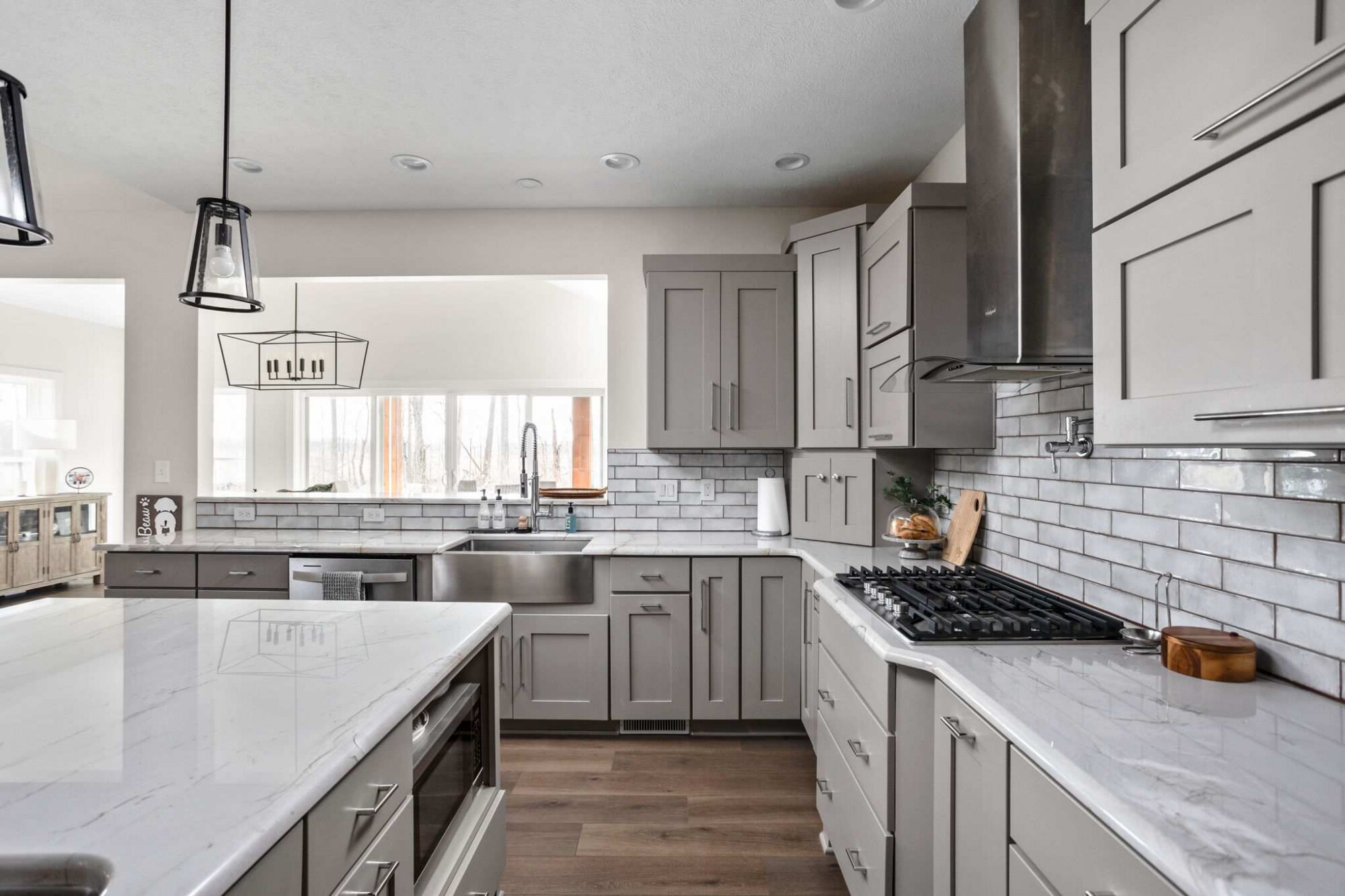 The kitchen now transitions naturally into the four season room. The finishes complement one another, and the improved lighting and sightlines make the entire main level feel more expansive.