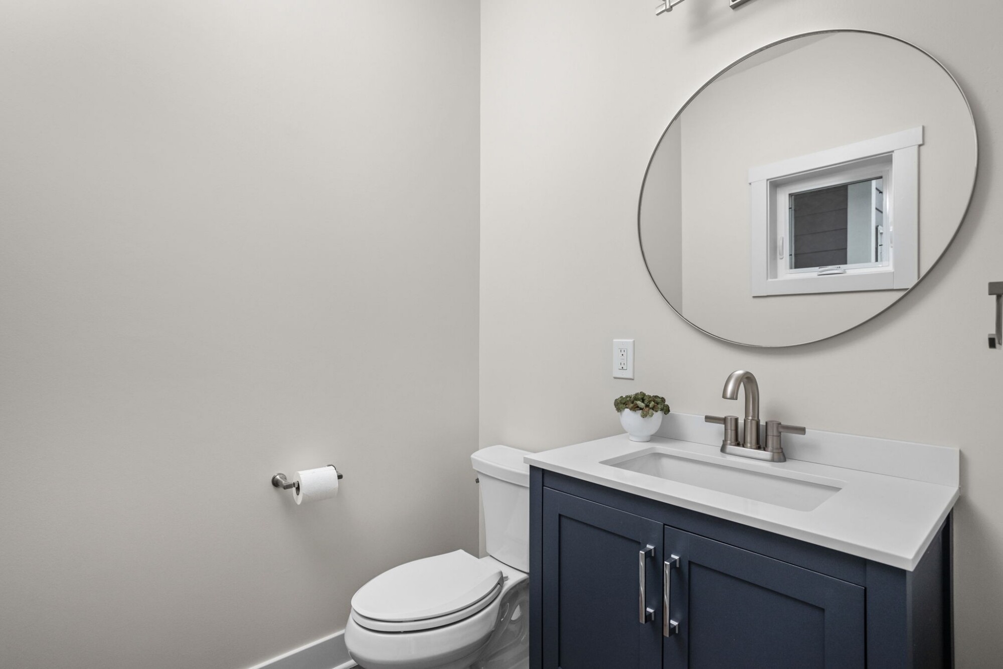 Adjacent to the mudroom is a half bath designed specifically to serve pool guests and outdoor gatherings. The vanity cabinetry in a deep blue finish adds character, while the cultured marble countertop offers durability and easy maintenance. Finishes were selected to feel elevated without being overly formal, reinforcing that this is a hardworking, high use space.