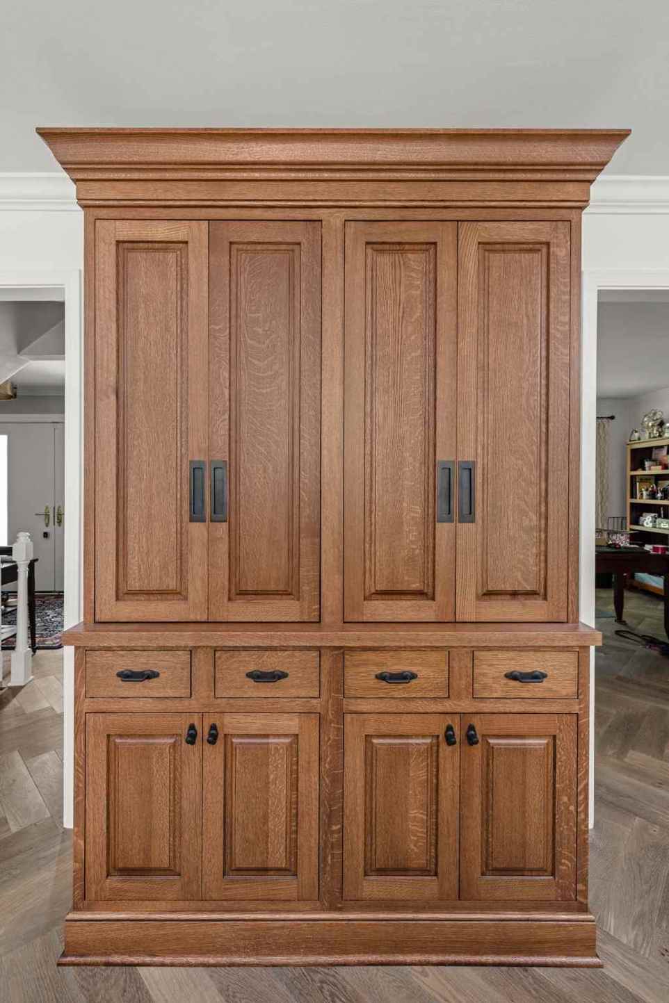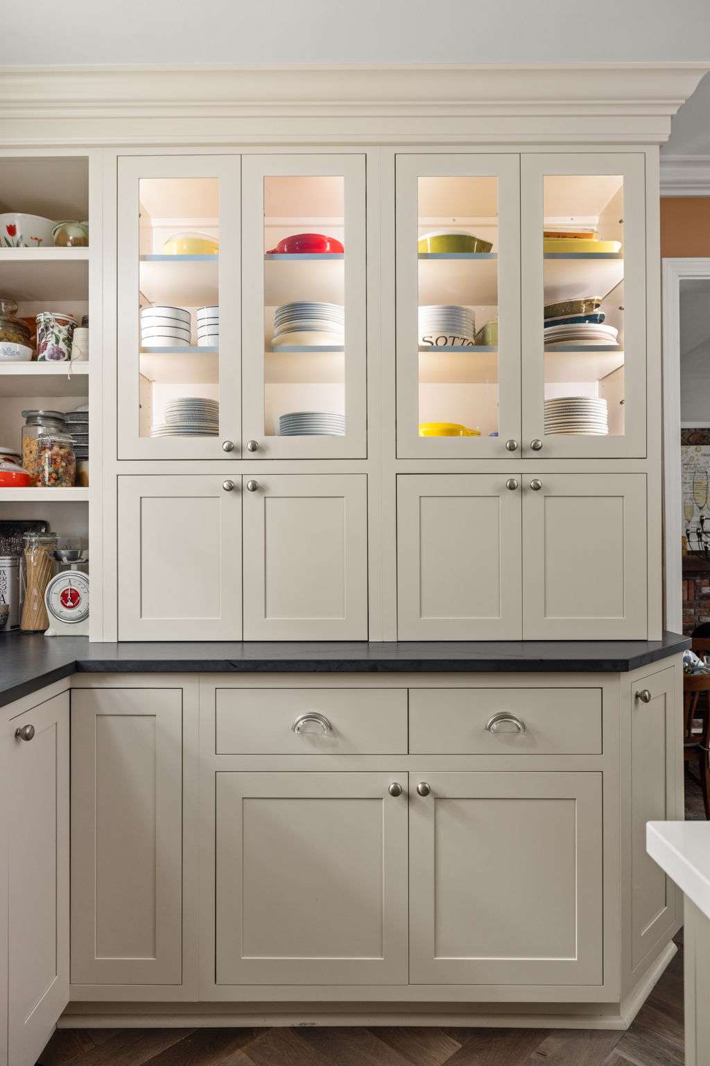 Finishes define the mood. Perimeter cabinetry in a soft, light neutral reflects daylight and pairs comfortably with the home’s millwork and floors. The primary island takes a deeper tone to ground the workstation without shouting. A furniture-scale Quarter Sawn White Oak hutch in Nutmeg with Black Glaze adds warmth and introduces texture giving the eye a place to rest—one of those elements that makes a new room feel like it has always belonged. Countertops balance wipe-clean practicality with subtle movement: a light surface crowns the primary island for visual calm during prep, while darker tops at the range and hospitality zones stand up to daily use. Hardware and lighting keep to coordinated finishes so the entire main level reads as one narrative rather than a patchwork of updates.