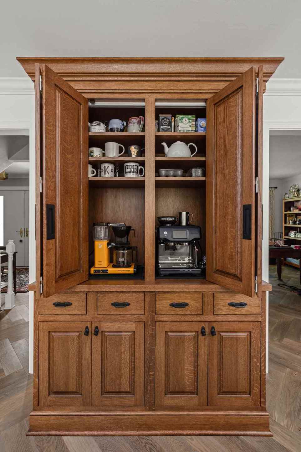 - Coffee Bar Cabinetry: Crystal Cabinet Works Keyline, Quarter Sawn White Oak in Nutmeg with Black Glaze