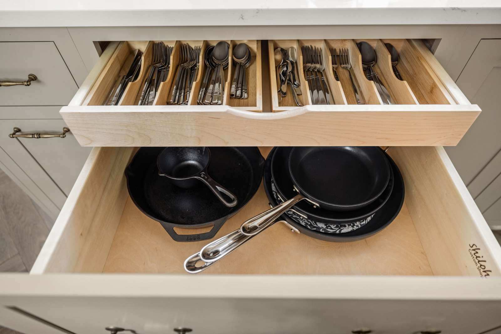 - Where do the heavy pieces live? Full-extension drawers under or near the range are a common favorite for pans and lids because they pull out to you.