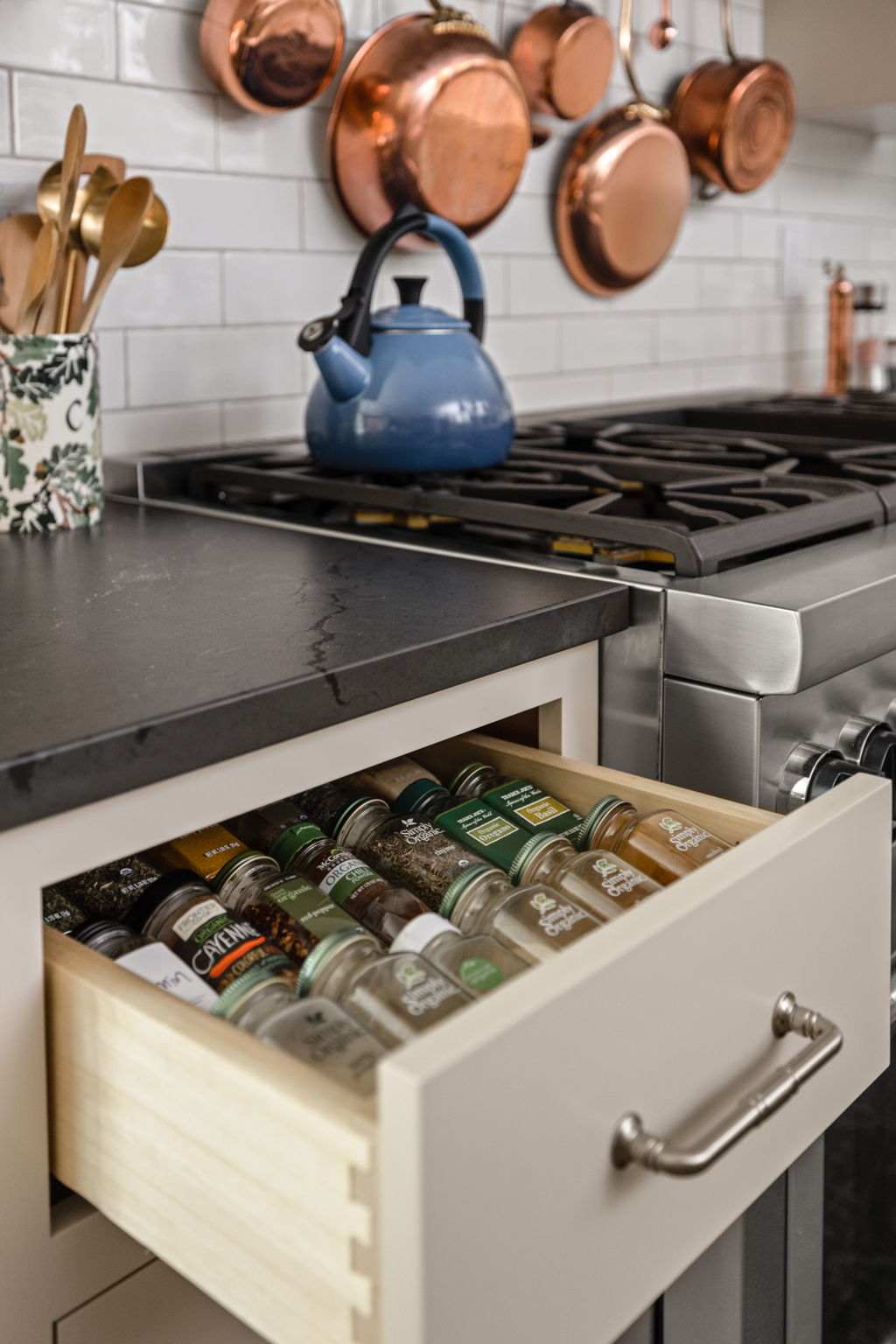 - What belongs in arm’s reach of heat? Many families choose a shallow organizer or nearby drawer for oils, salts, and the spices used weekly.