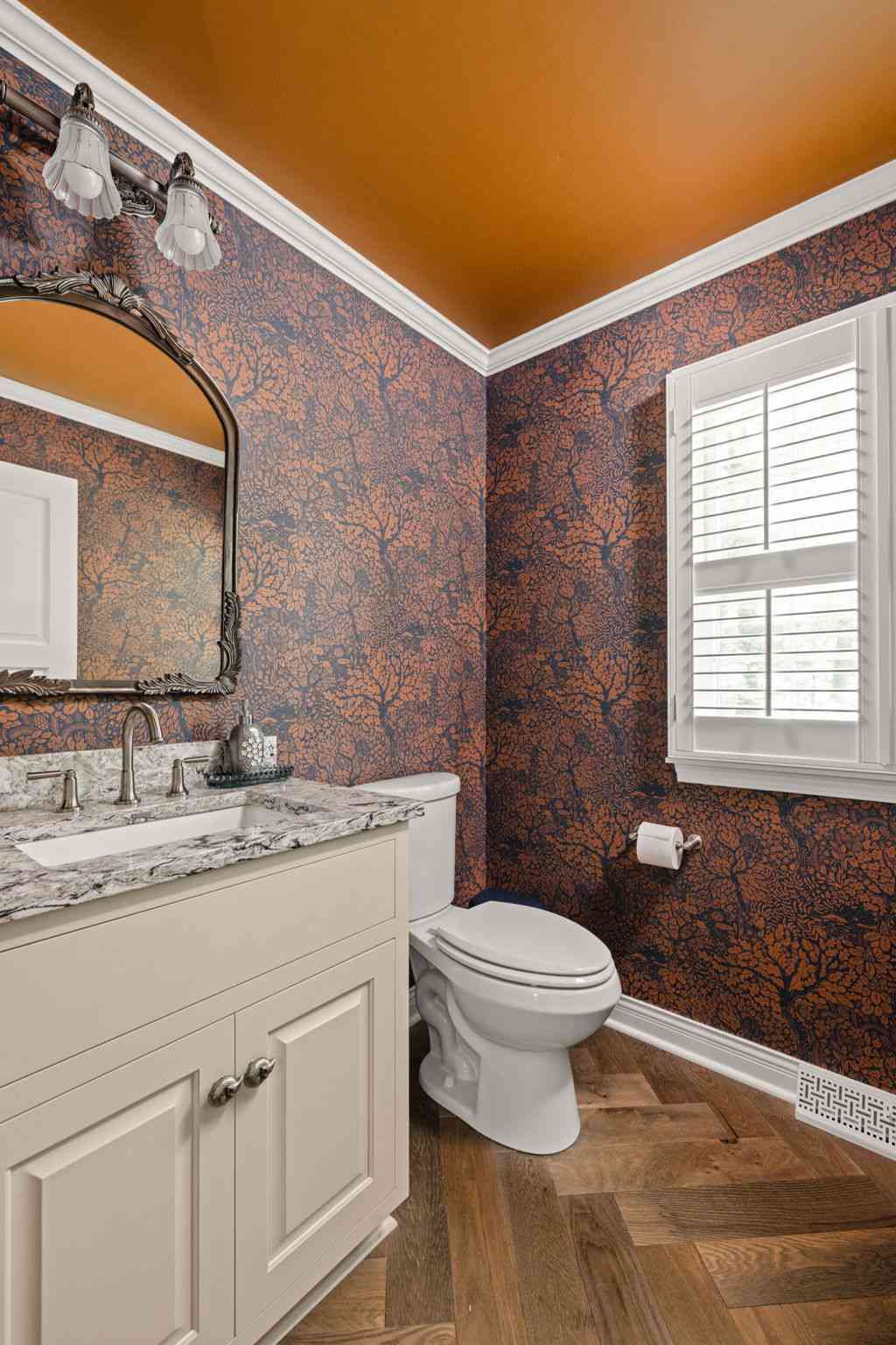 The powder bath follows the same disciplined approach, but with a confident, pattern-forward twist. A vanity scaled precisely to the wall, flattering vertical lighting, and coordinated metals keep the bold wallpaper feeling tailored rather than busy. Up close, the proportions and trim details do the quiet work, so the room reads striking at first glance and beautifully composed the longer you’re in it. It ties back to the kitchen through shared tones and profiles, without feeling like a copy.